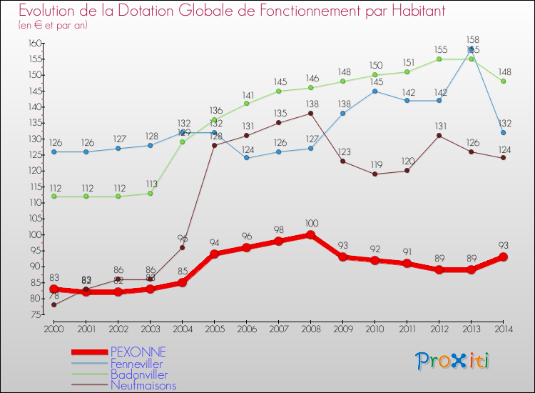 Dans le même temps, la Dotation Globale de Fonctionnement accordée aux communes françaises similaires à Pexonne était de 199 € par habitant, en 2014.