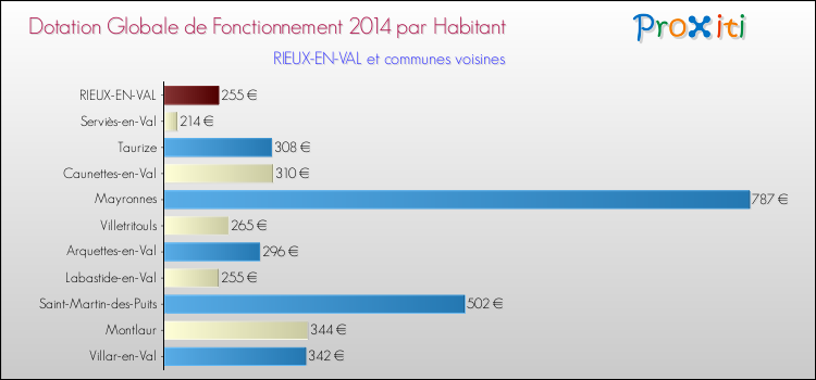 Le graphique ci dessous indique la Dotation Globale de Fonctionnement accordée par habitant à Rieux-en-Val en 2014 par rapport aux communes voisines.