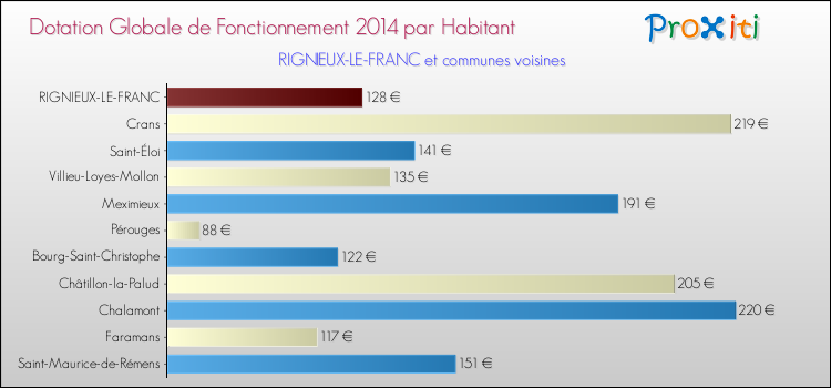 Le graphique ci dessous indique la Dotation Globale de Fonctionnement accordée par habitant à Rignieux-le-Franc en 2014 par rapport aux communes voisines.
