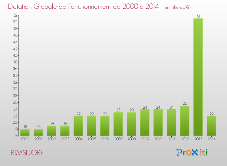 Dans le même temps, la Dotation Globale de Fonctionnement accordée aux communes françaises similaires à Rimsdorf était de 199 € par habitant, en 2014.