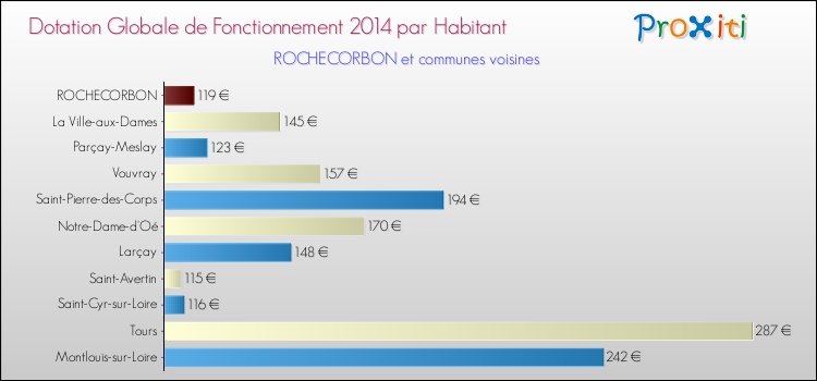 Dans le même temps, la Dotation Globale de Fonctionnement accordée aux communes françaises similaires à Rochecorbon était de 177 € par habitant, en 2014.