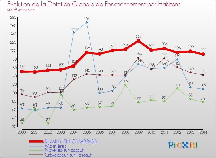 Le graphique ci dessous indique la Dotation Globale de Fonctionnement accordée par habitant à Rumilly-en-Cambrésis en 2014 par rapport aux communes voisines.