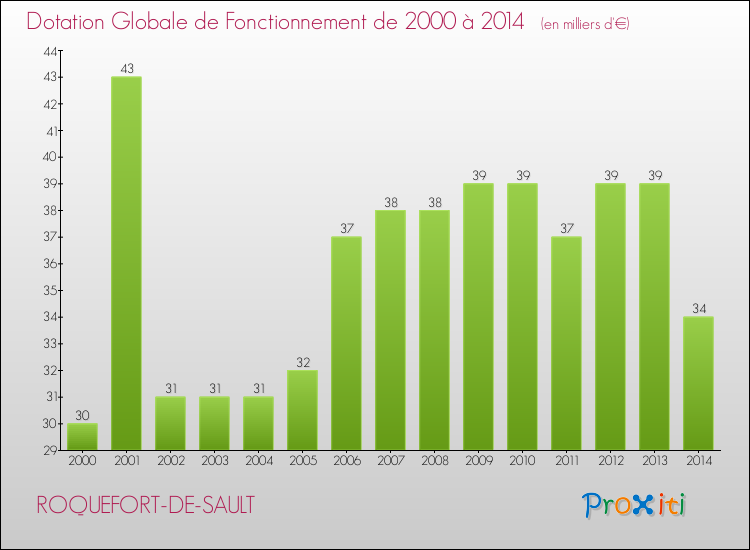 En effet, la dotation globale de fonctionnement versée par l'état en 2014 à la seule commune de Roquefort-de-Sault était de : 34 000 € au total.