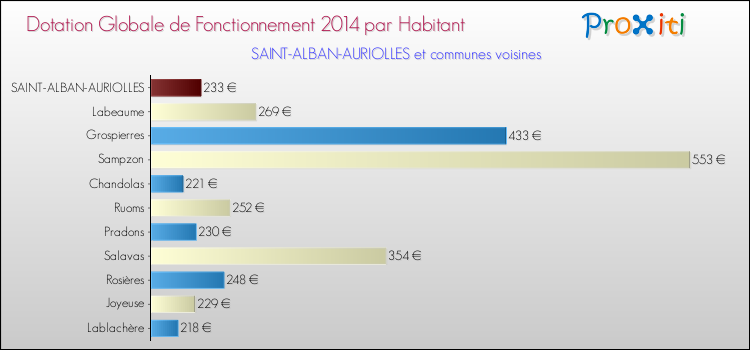Le graphique ci dessous indique la Dotation Globale de Fonctionnement accordée par habitant à Saint-Alban-Auriolles en 2014 par rapport aux communes voisines.