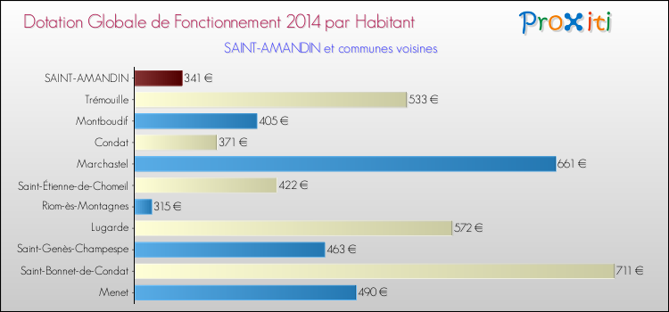 Le graphique ci dessous indique la Dotation Globale de Fonctionnement accordée par habitant à Saint-Amandin en 2014 par rapport aux communes voisines.