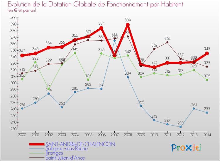 Le graphique ci dessous indique la Dotation Globale de Fonctionnement accordée par habitant à Saint-André-de-Chalencon en 2014 par rapport aux communes voisines.