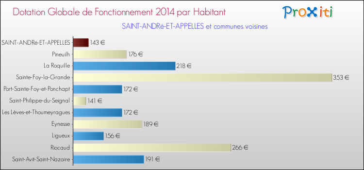 Le graphique ci dessous indique la Dotation Globale de Fonctionnement accordée par habitant à Saint-André-et-Appelles en 2014 par rapport aux communes voisines.