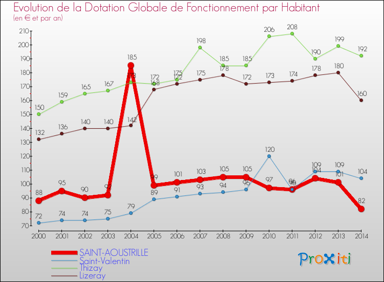 Le graphique ci dessous indique la Dotation Globale de Fonctionnement accordée par habitant à Saint-Aoustrille en 2014 par rapport aux communes voisines.