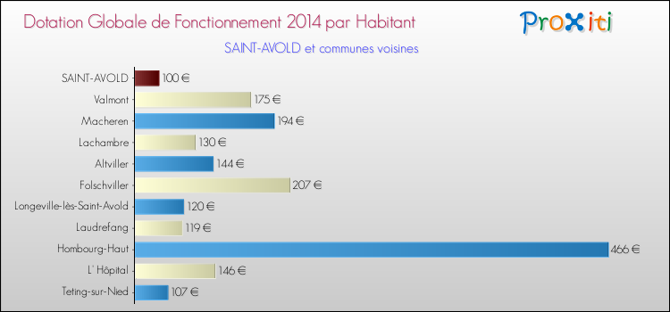 Le graphique ci dessous indique la Dotation Globale de Fonctionnement accordée par habitant à Saint-Avold en 2014 par rapport aux communes voisines.