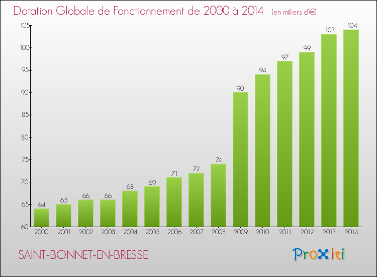 En effet, la dotation globale de fonctionnement versée par l'état en 2014 à la seule commune de Saint-Bonnet-en-Bresse était de : 104 000 € au total.