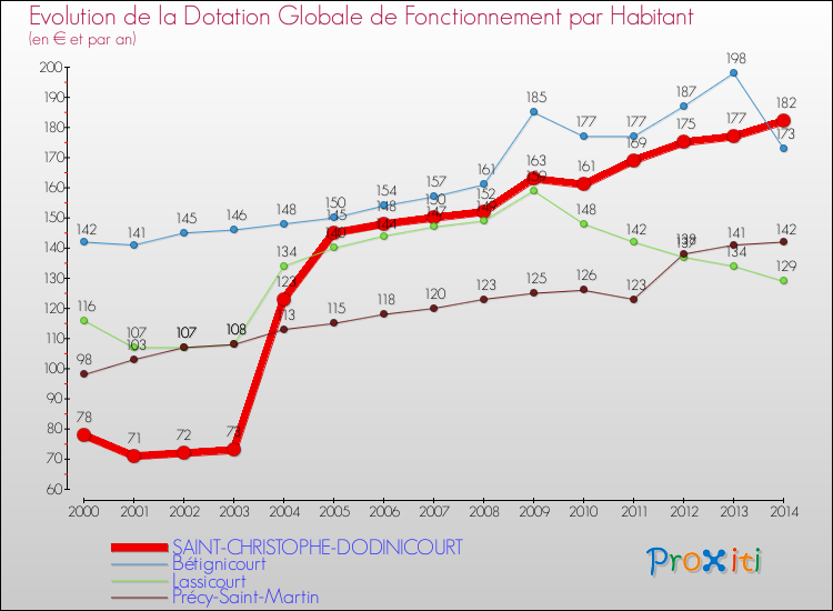 Dans le même temps, la Dotation Globale de Fonctionnement accordée aux communes françaises similaires à Saint-Christophe-Dodinicourt était de 230 € par habitant, en 2014.