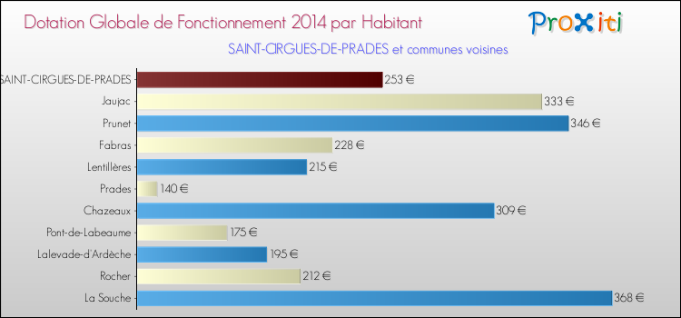 Le graphique ci dessous indique la Dotation Globale de Fonctionnement accordée par habitant à Saint-Cirgues-de-Prades en 2014 par rapport aux communes voisines.