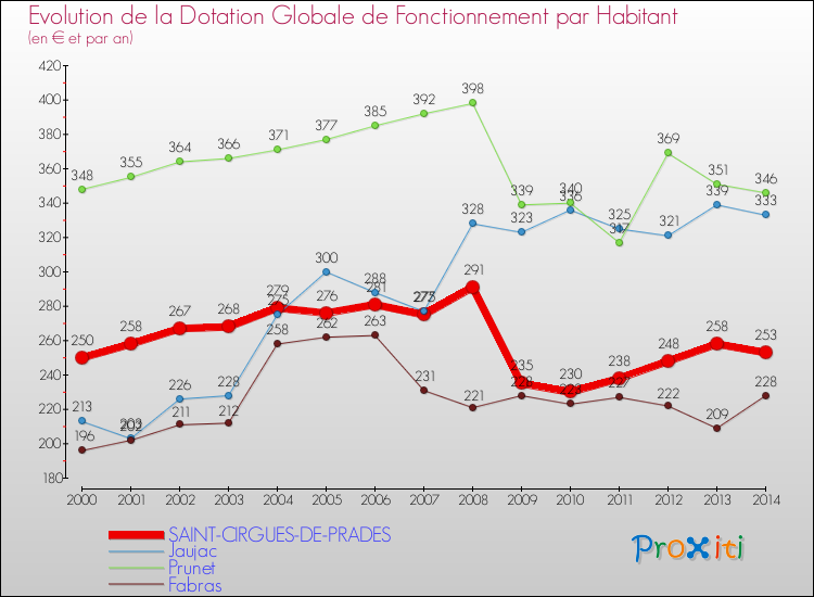 Dans le même temps, la Dotation Globale de Fonctionnement accordée aux communes françaises similaires à Saint-Cirgues-de-Prades était de 226 € par habitant, en 2014.