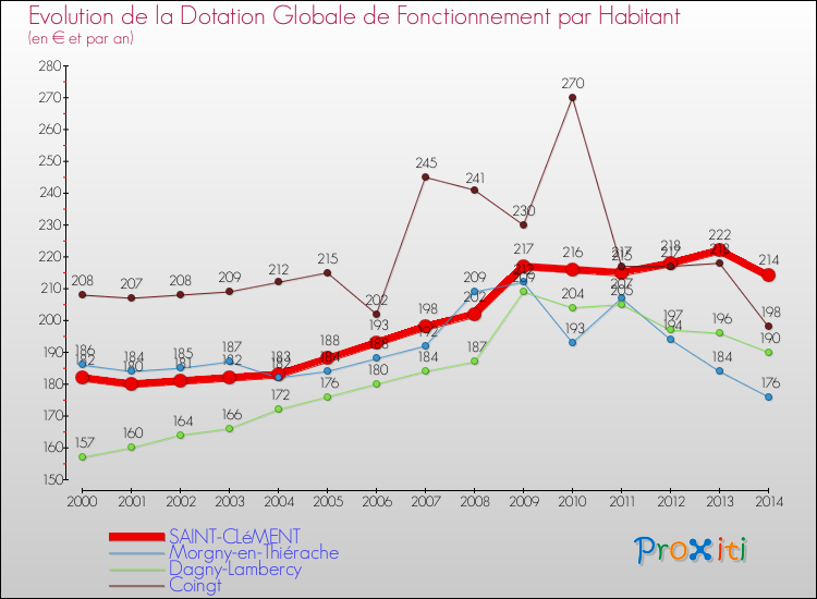 Dans le même temps, la Dotation Globale de Fonctionnement accordée aux communes françaises similaires à Saint-Clément était de 226 € par habitant, en 2014.