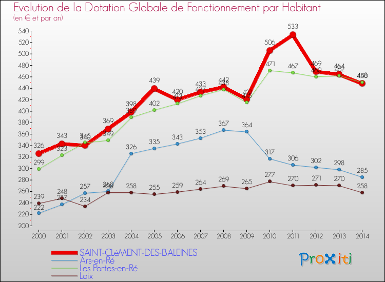 A Saint-Clément-des-Baleines, en 2014 un habitant reçoit donc plus de subventions au titre de la DGF que pour des communes similaires.