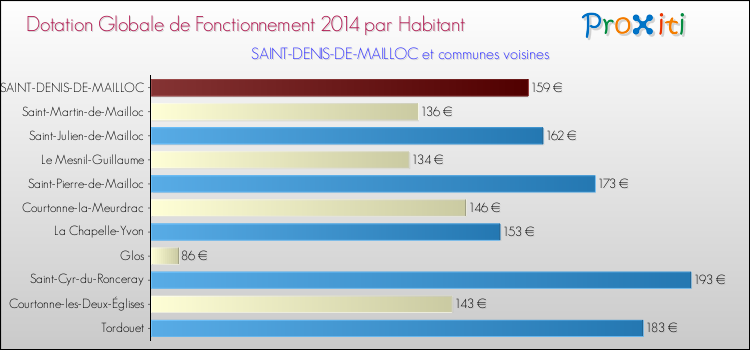 Le graphique ci dessous indique la Dotation Globale de Fonctionnement accordée par habitant à Saint-Denis-de-Mailloc en 2014 par rapport aux communes voisines.