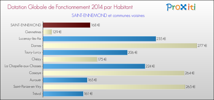 Le graphique ci dessous indique la Dotation Globale de Fonctionnement accordée par habitant à Saint-Ennemond en 2014 par rapport aux communes voisines.