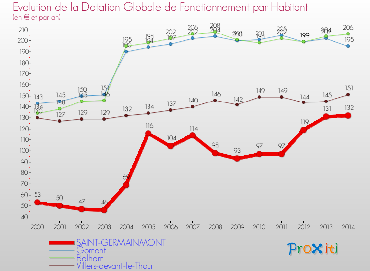Dans le même temps, la Dotation Globale de Fonctionnement accordée aux communes françaises similaires à Saint-Germainmont était de 171 € par habitant, en 2014.