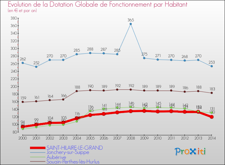 Dans le même temps, la Dotation Globale de Fonctionnement accordée aux communes françaises similaires à Saint-Hilaire-le-Grand était de 176 € par habitant, en 2014.