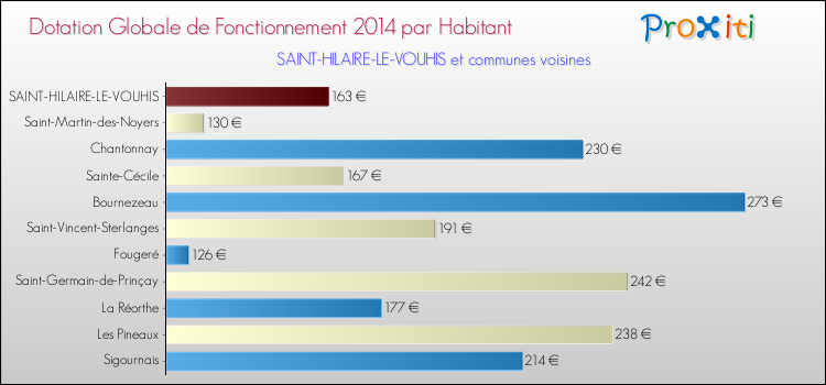 Le graphique ci dessous indique la Dotation Globale de Fonctionnement accordée par habitant à Saint-Hilaire-le-Vouhis en 2014 par rapport aux communes voisines.
