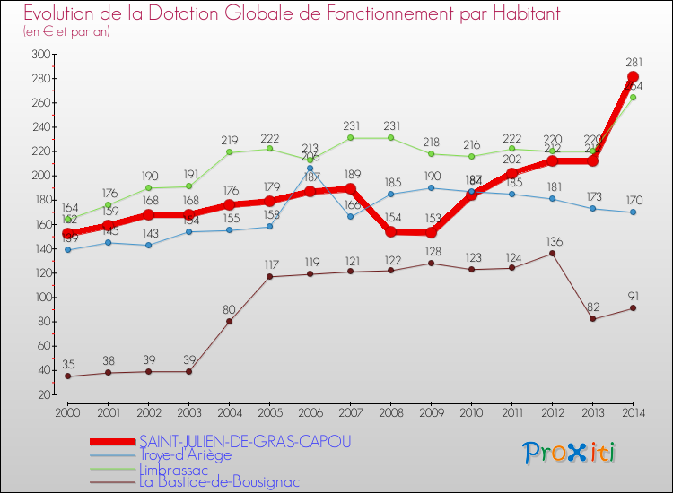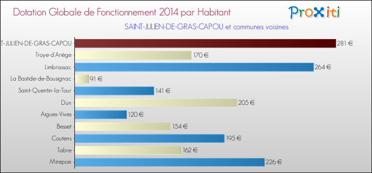 Le graphique ci dessous indique la Dotation Globale de Fonctionnement accordée par habitant à Saint-Julien-de-Gras-Capou en 2014 par rapport aux communes voisines.