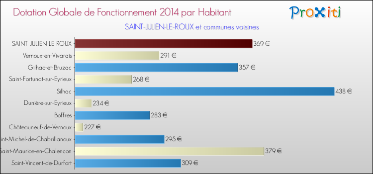 Le graphique ci dessous indique la Dotation Globale de Fonctionnement accordée par habitant à Saint-Julien-le-Roux en 2014 par rapport aux communes voisines.