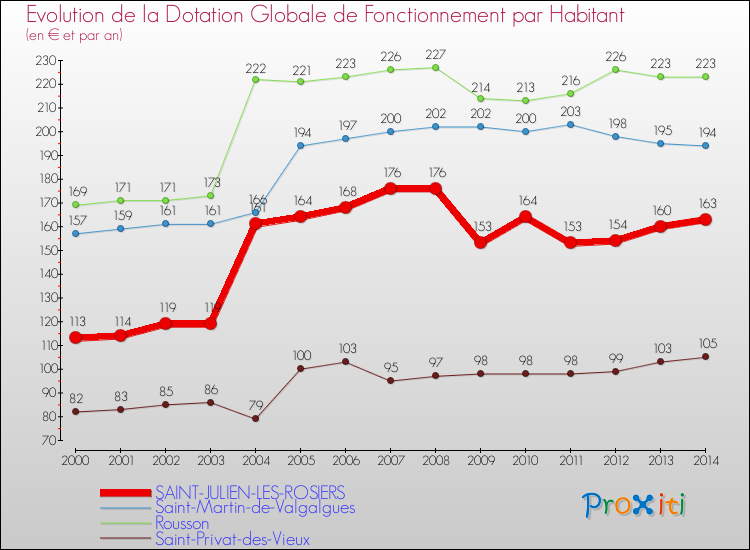 Dans le même temps, la Dotation Globale de Fonctionnement accordée aux communes françaises similaires à Saint-Julien-les-Rosiers était de 177 € par habitant, en 2014.