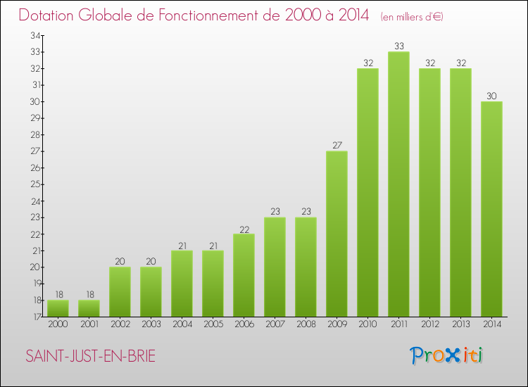 Dans le même temps, la Dotation Globale de Fonctionnement accordée aux communes françaises similaires à Saint-Just-en-Brie était de 230 € par habitant, en 2014.