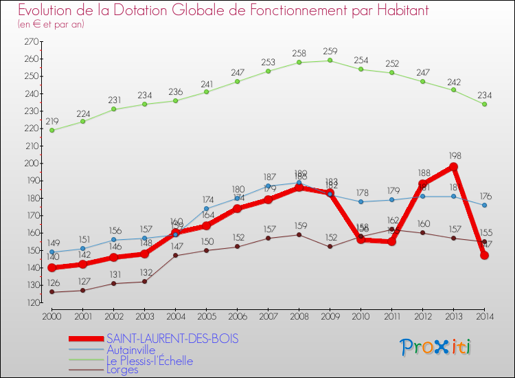 Dans le même temps, la Dotation Globale de Fonctionnement accordée aux communes françaises similaires à Saint-Laurent-des-Bois était de 176 € par habitant, en 2014.
