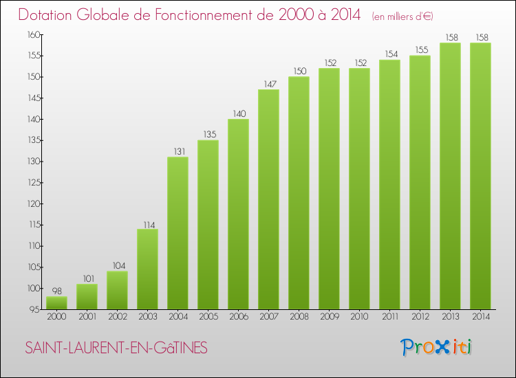 Dans le même temps, la Dotation Globale de Fonctionnement accordée aux communes françaises similaires à Saint-Laurent-en-Gâtines était de 171 € par habitant, en 2014.