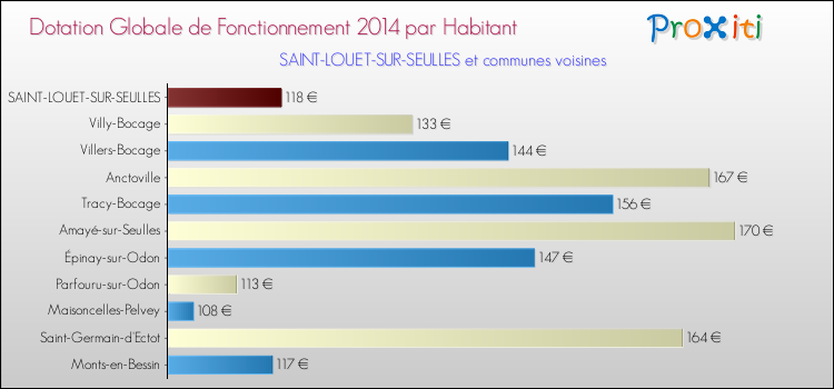 Le graphique ci dessous indique la Dotation Globale de Fonctionnement accordée par habitant à Saint-Louet-sur-Seulles en 2014 par rapport aux communes voisines.