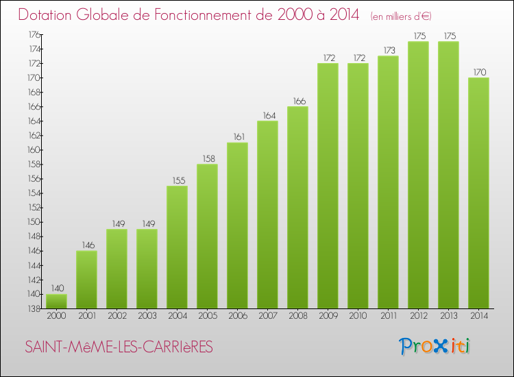 Dans le même temps, la Dotation Globale de Fonctionnement accordée aux communes françaises similaires à Saint-Même-les-Carrières était de 171 € par habitant, en 2014.