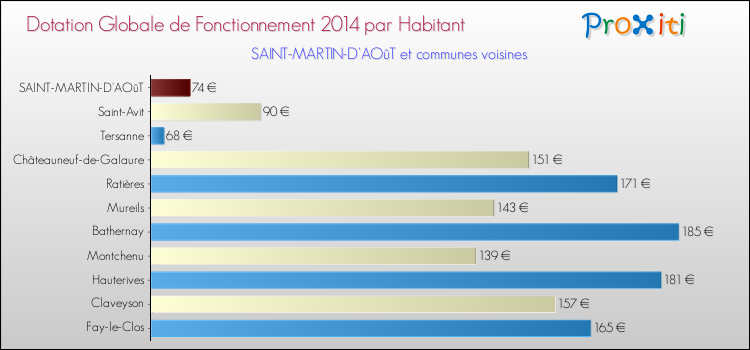 Le graphique ci dessous indique la Dotation Globale de Fonctionnement accordée par habitant à Saint-Martin-d'Août en 2014 par rapport aux communes voisines.