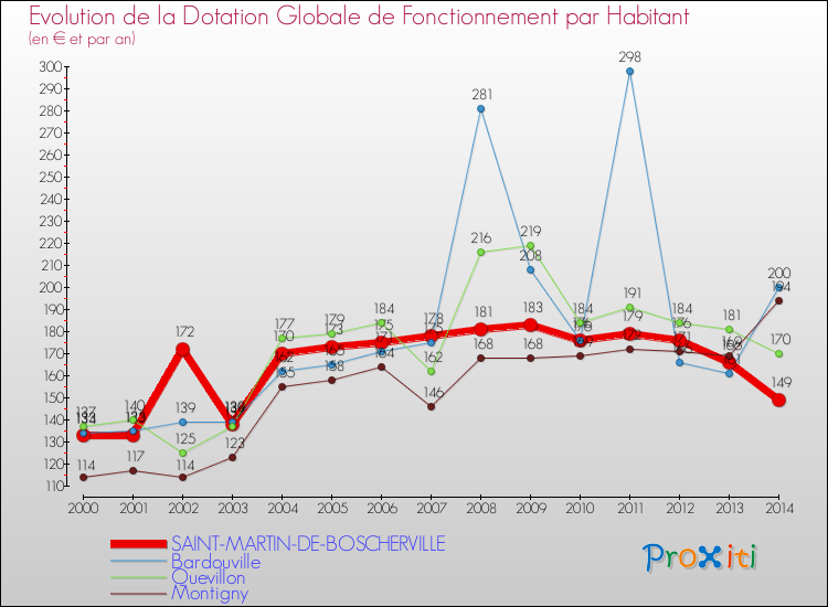 Dans le même temps, la Dotation Globale de Fonctionnement accordée aux communes françaises similaires à Saint-Martin-de-Boscherville était de 171 € par habitant, en 2014.