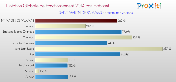 Le graphique ci dessous indique la Dotation Globale de Fonctionnement accordée par habitant à Saint-Martin-de-Valamas en 2014 par rapport aux communes voisines.