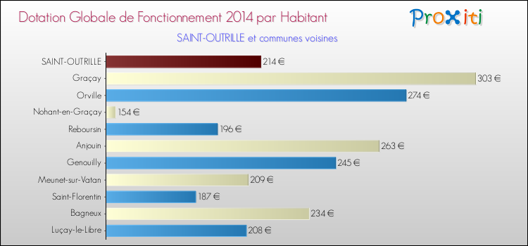 Le graphique ci dessous indique la Dotation Globale de Fonctionnement accordée par habitant à Saint-Outrille en 2014 par rapport aux communes voisines.