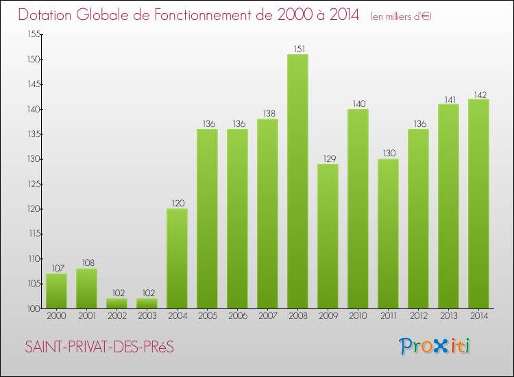 En effet, la dotation globale de fonctionnement versée par l'état en 2014 à la seule commune de Saint-Privat-des-Prés était de : 142 000 € au total.