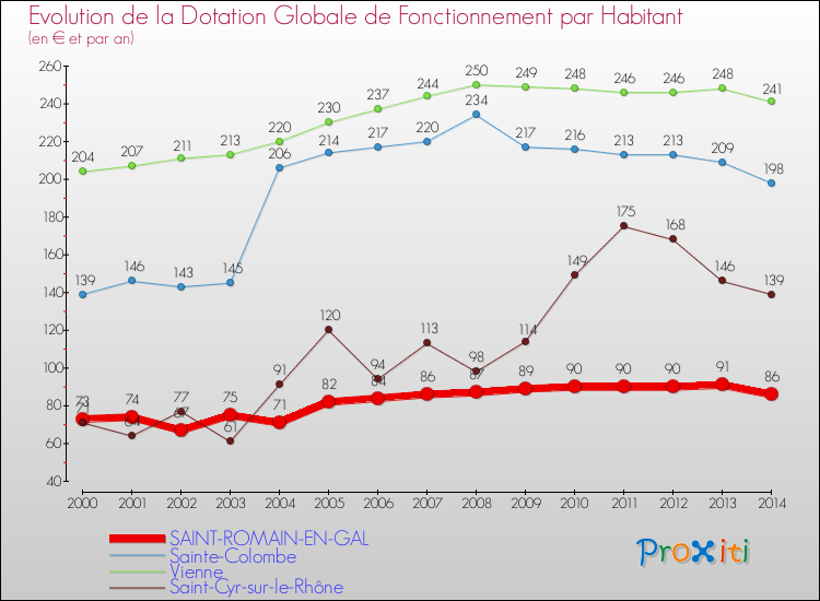 Dans le même temps, la Dotation Globale de Fonctionnement accordée aux communes françaises similaires à Saint-Romain-en-Gal était de 171 € par habitant, en 2014.