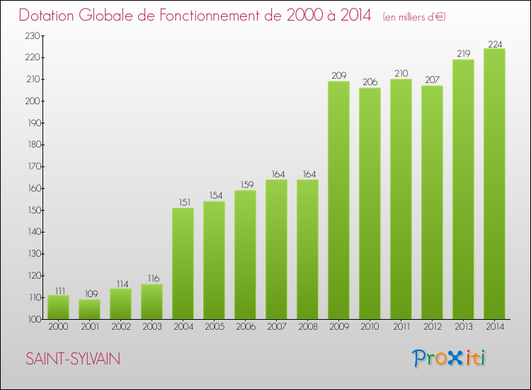 Dans le même temps, la Dotation Globale de Fonctionnement accordée aux communes françaises similaires à Saint-Sylvain était de 216 € par habitant, en 2014.