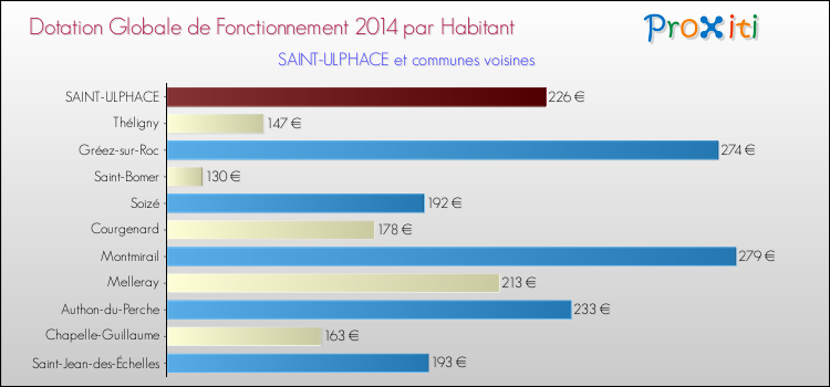 Le graphique ci dessous indique la Dotation Globale de Fonctionnement accordée par habitant à Saint-Ulphace en 2014 par rapport aux communes voisines.