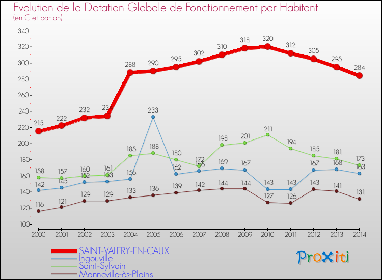 Dans le même temps, la Dotation Globale de Fonctionnement accordée aux communes françaises similaires à Saint-Valery-en-Caux était de 256 € par habitant, en 2014.