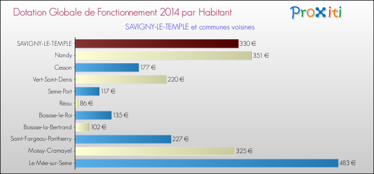 Le graphique ci dessous indique la Dotation Globale de Fonctionnement accordée par habitant à Savigny-le-Temple en 2014 par rapport aux communes voisines.