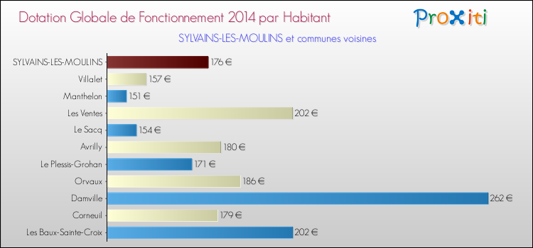 Le graphique ci dessous indique la Dotation Globale de Fonctionnement accordée par habitant à Sylvains-les-Moulins en 2014 par rapport aux communes voisines.
