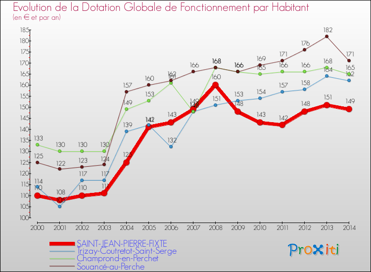 Le graphique ci dessous indique la Dotation Globale de Fonctionnement accordée par habitant à Saint-Jean-Pierre-Fixte en 2014 par rapport aux communes voisines.