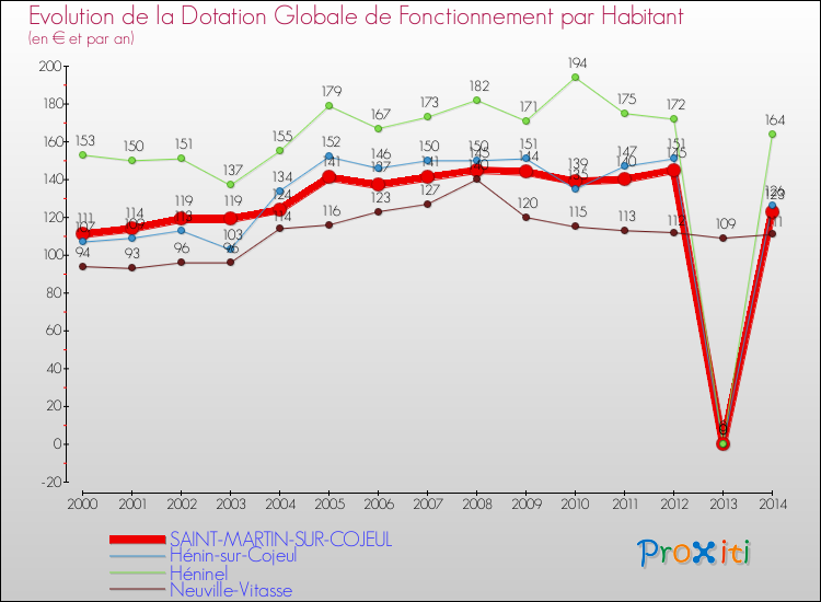 Le graphique ci dessous indique la Dotation Globale de Fonctionnement accordée par habitant à Saint-Martin-sur-Cojeul en 2014 par rapport aux communes voisines.
