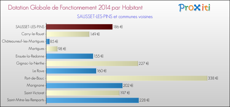 Le graphique ci dessous indique la Dotation Globale de Fonctionnement accordée par habitant à Sausset-les-Pins en 2014 par rapport aux communes voisines.