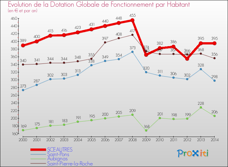 Dans le même temps, la Dotation Globale de Fonctionnement accordée aux communes françaises similaires à Sceautres était de 230 € par habitant, en 2014.