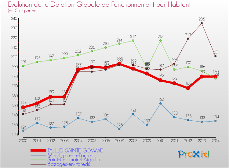 Dans le même temps, la Dotation Globale de Fonctionnement accordée aux communes françaises similaires à Tallud-Sainte-Gemme était de 176 € par habitant, en 2014.