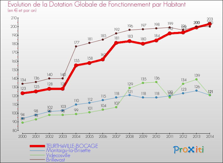 Dans le même temps, la Dotation Globale de Fonctionnement accordée aux communes françaises similaires à Teurthéville-Bocage était de 216 € par habitant, en 2014.