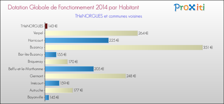 Le graphique ci dessous indique la Dotation Globale de Fonctionnement accordée par habitant à Thénorgues en 2014 par rapport aux communes voisines.